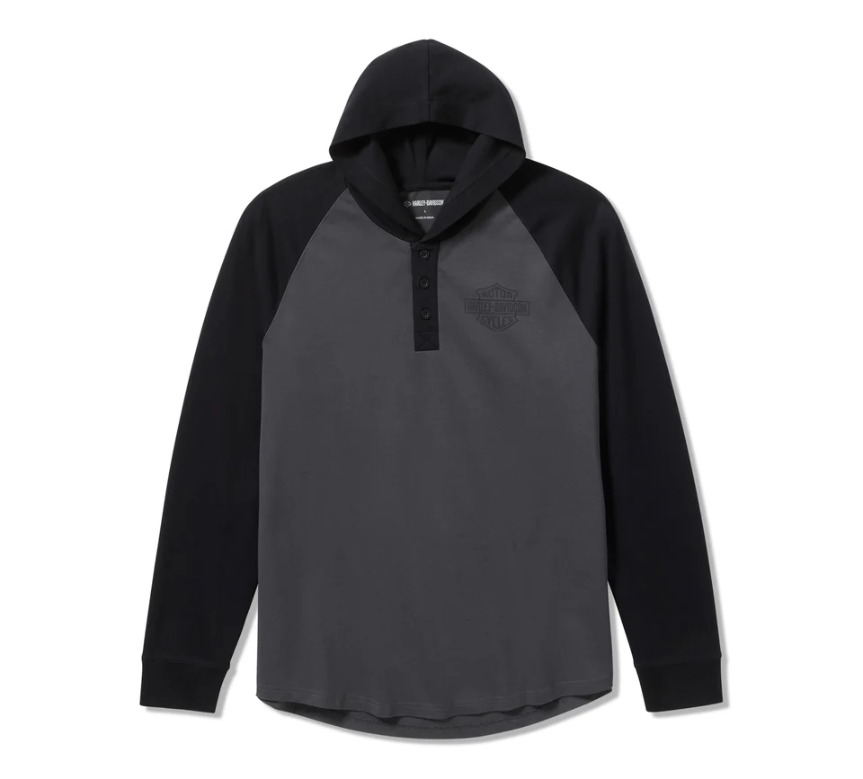 Men’s HDMC Raglan Henley with Hood – Colorblock – Asphalt & Harley Black