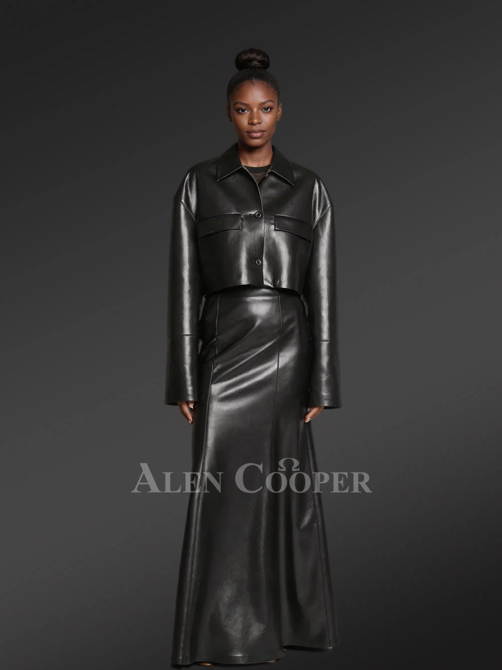 Button down Crop Leather Jacket And Stylish Leather Skirt of Lambskin