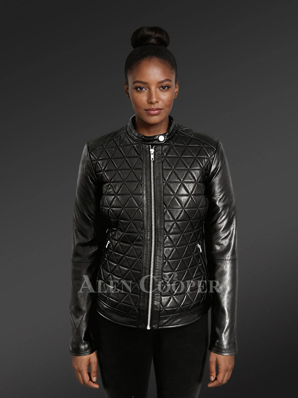 Women’s Black Moto Leather Jacket with Diamond Pattern